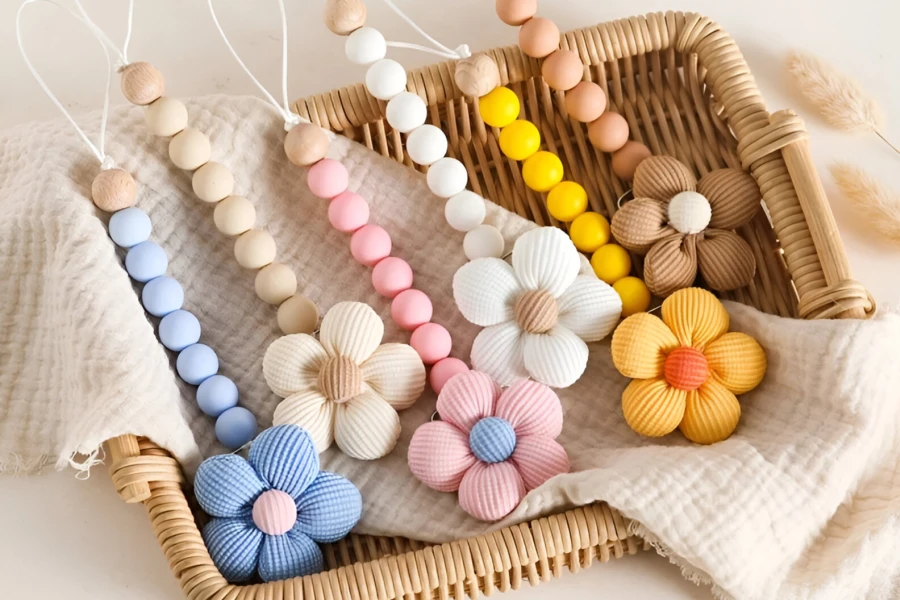 Add a touch of elegance to pacifier management with this wooden flower clip. Its natural materials and adorable design make it a safe and stylish accessory. Parents will love its practicality, as it keeps pacifiers within reach and off the floor.